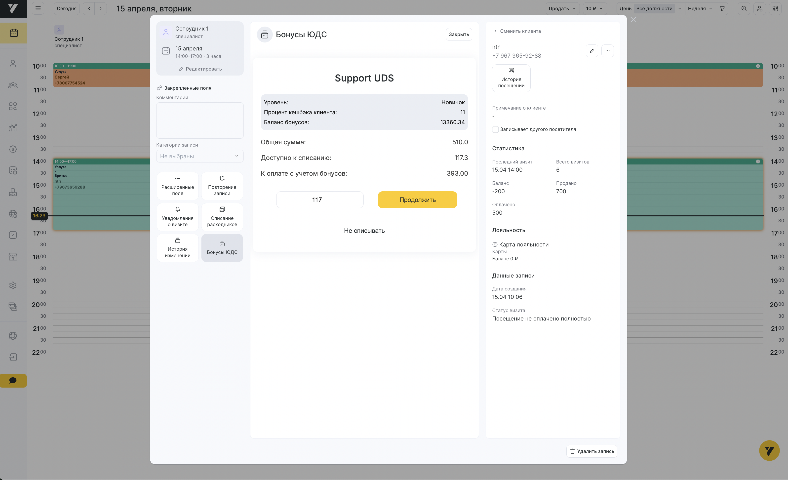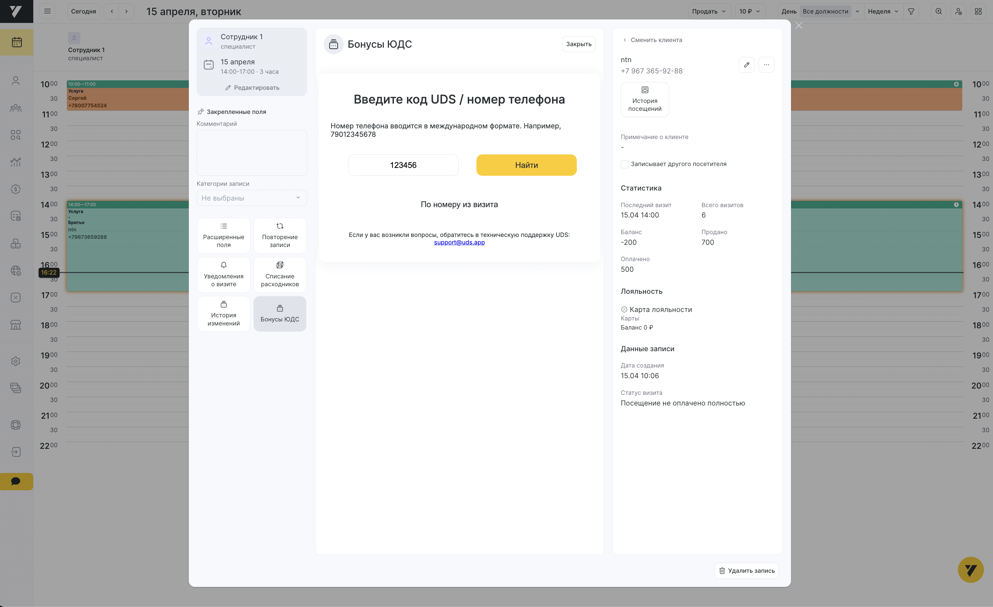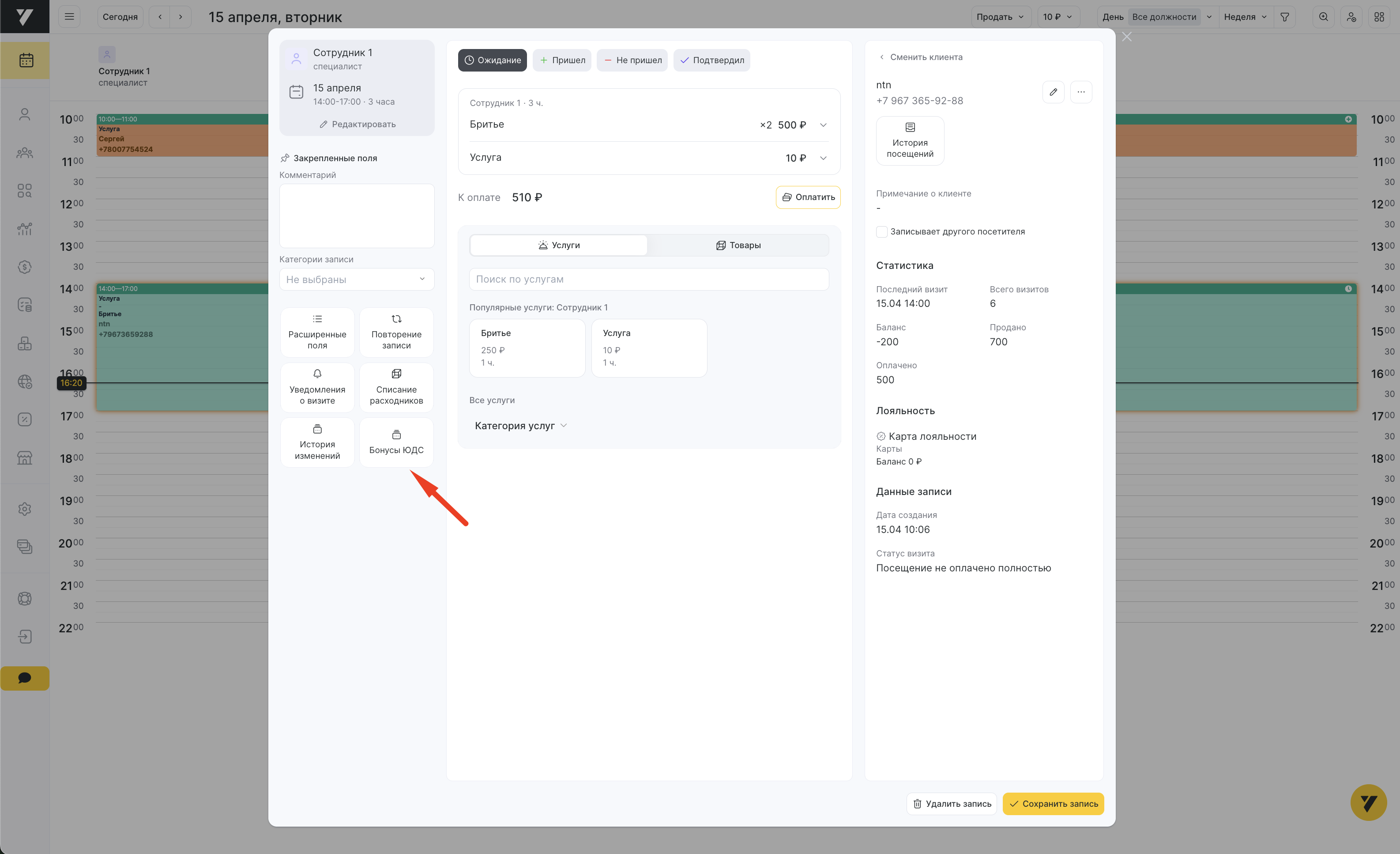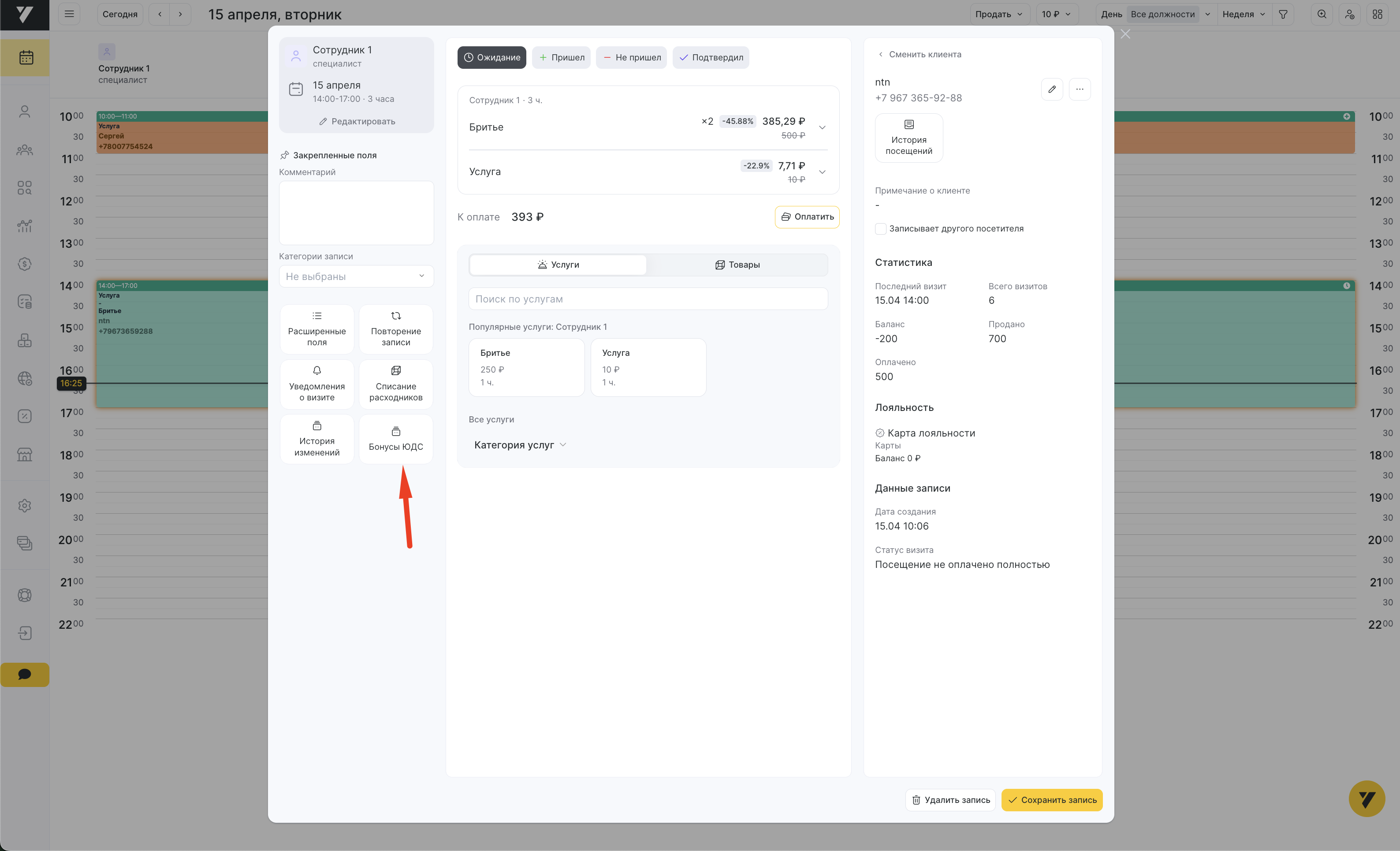 Шаг 1. Откройте запись, заполните данные о клиенте, добавьте необходимые услуги и товары и нажмите кнопку "Бонусы ЮДС". В случае если кнопка отсутствует, закройте и откройте снова окно записи.