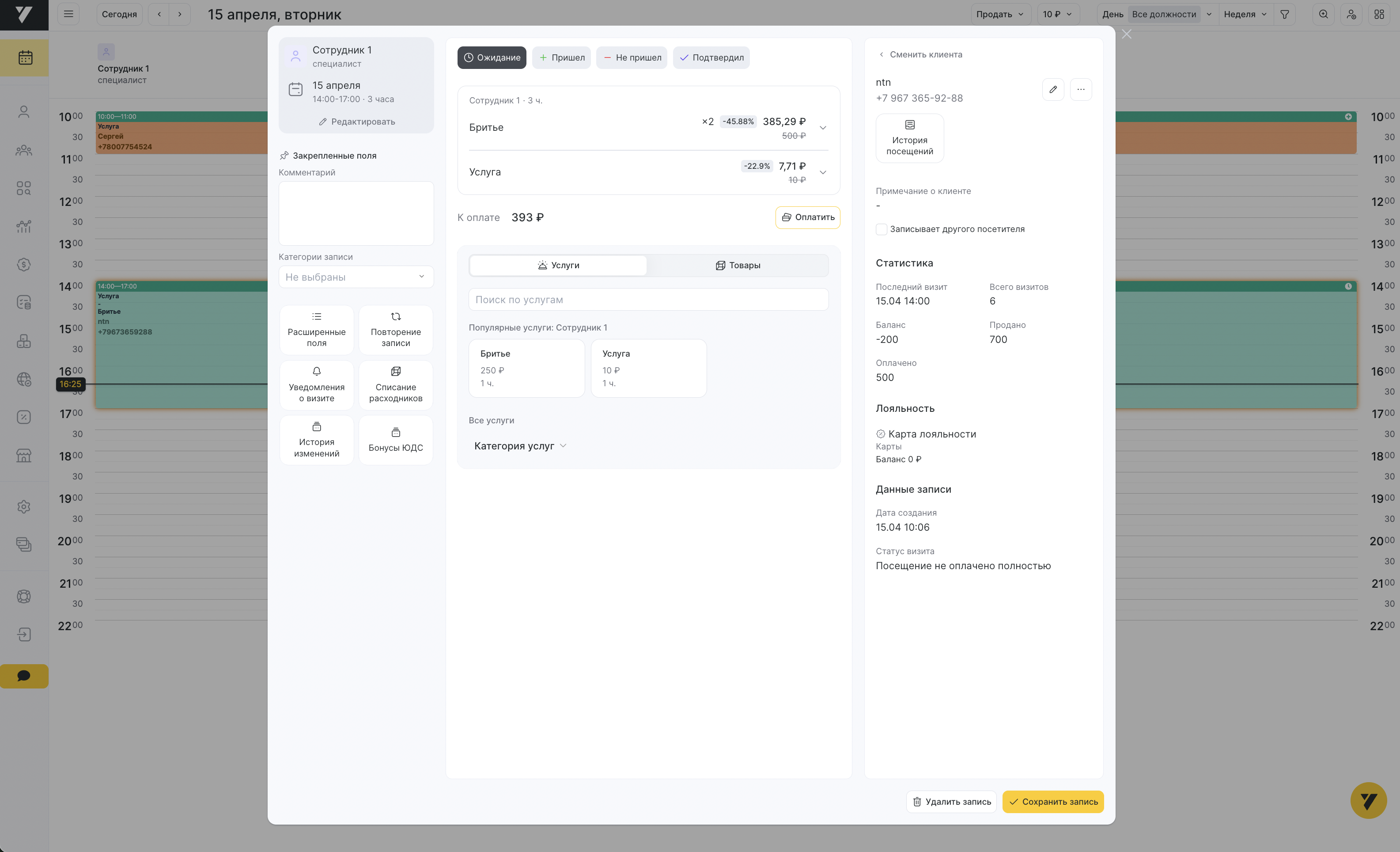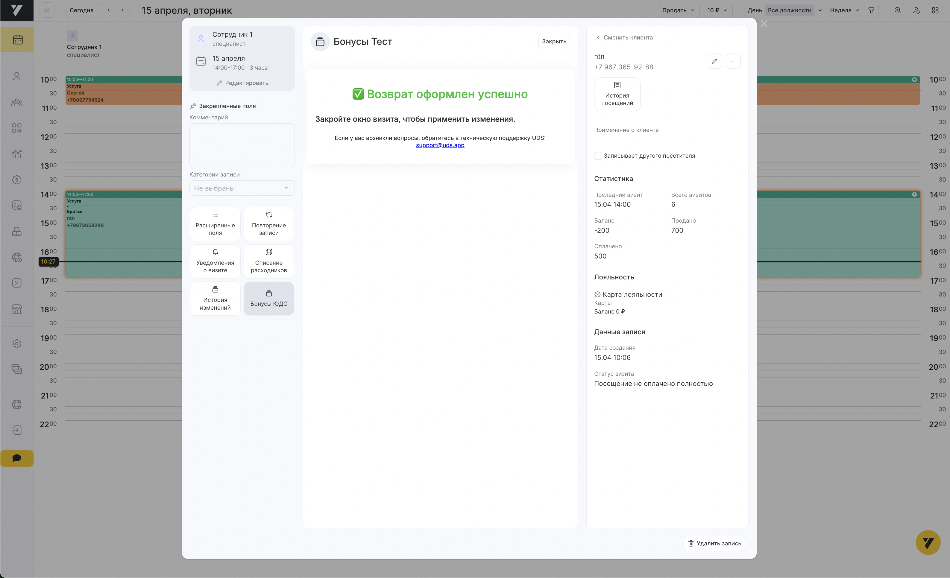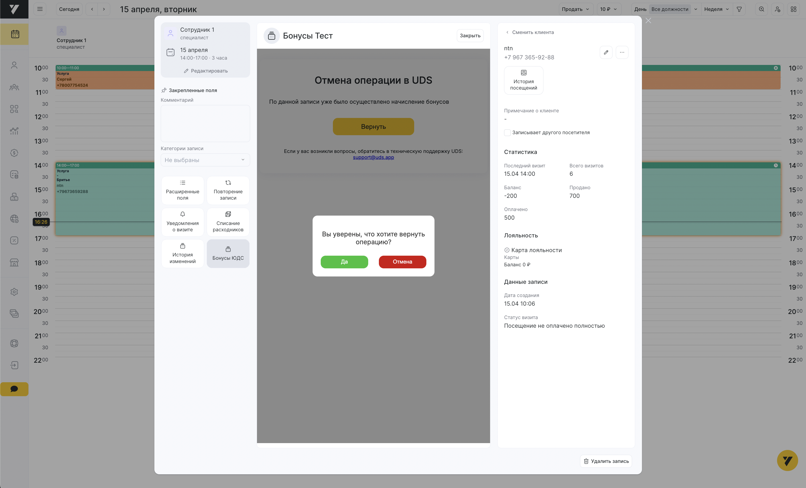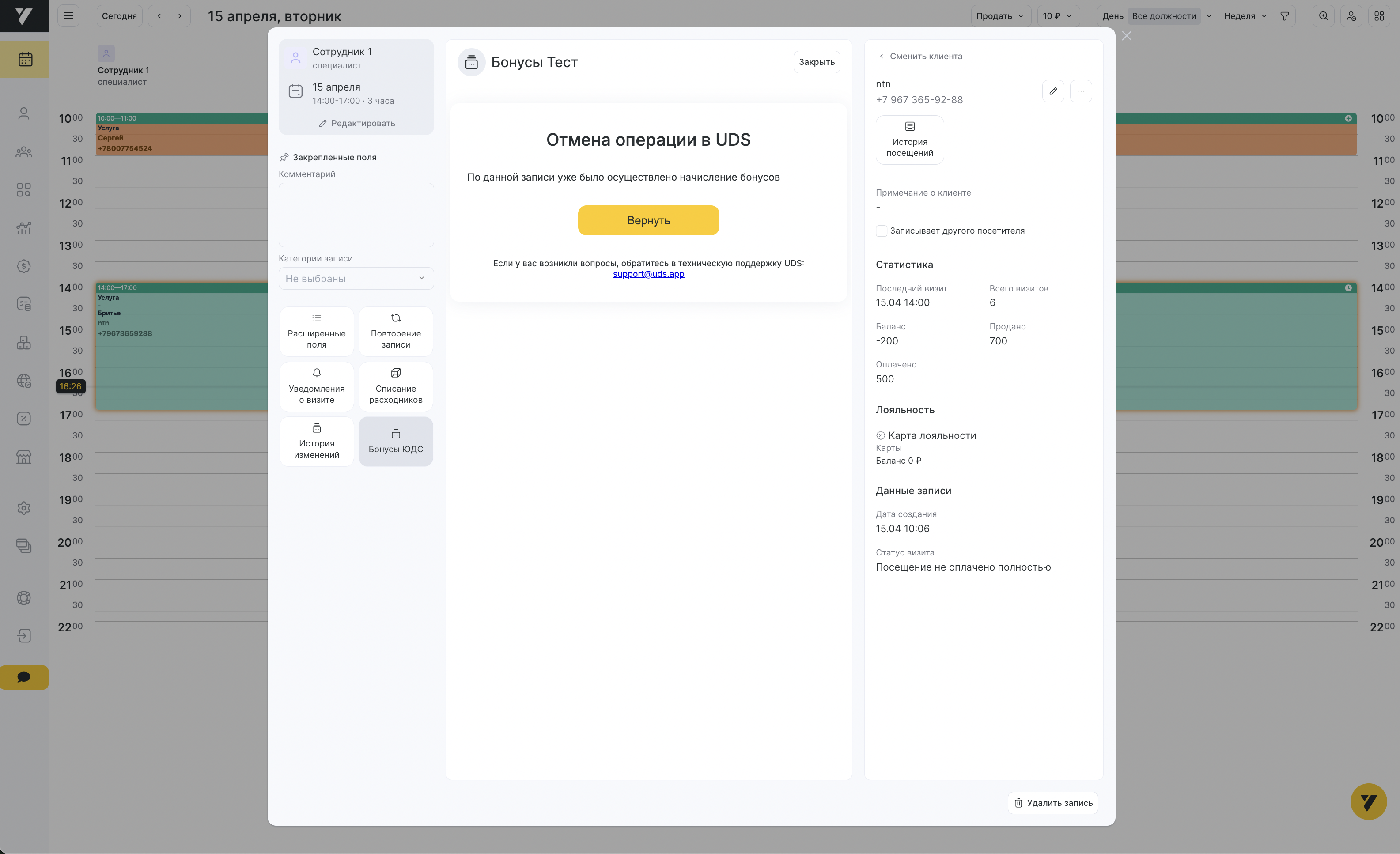 Шаг 1. Откройте запись, заполните данные о клиенте, добавьте необходимые услуги и товары и нажмите кнопку "Бонусы ЮДС". В случае если кнопка отсутствует, закройте и откройте снова окно записи.