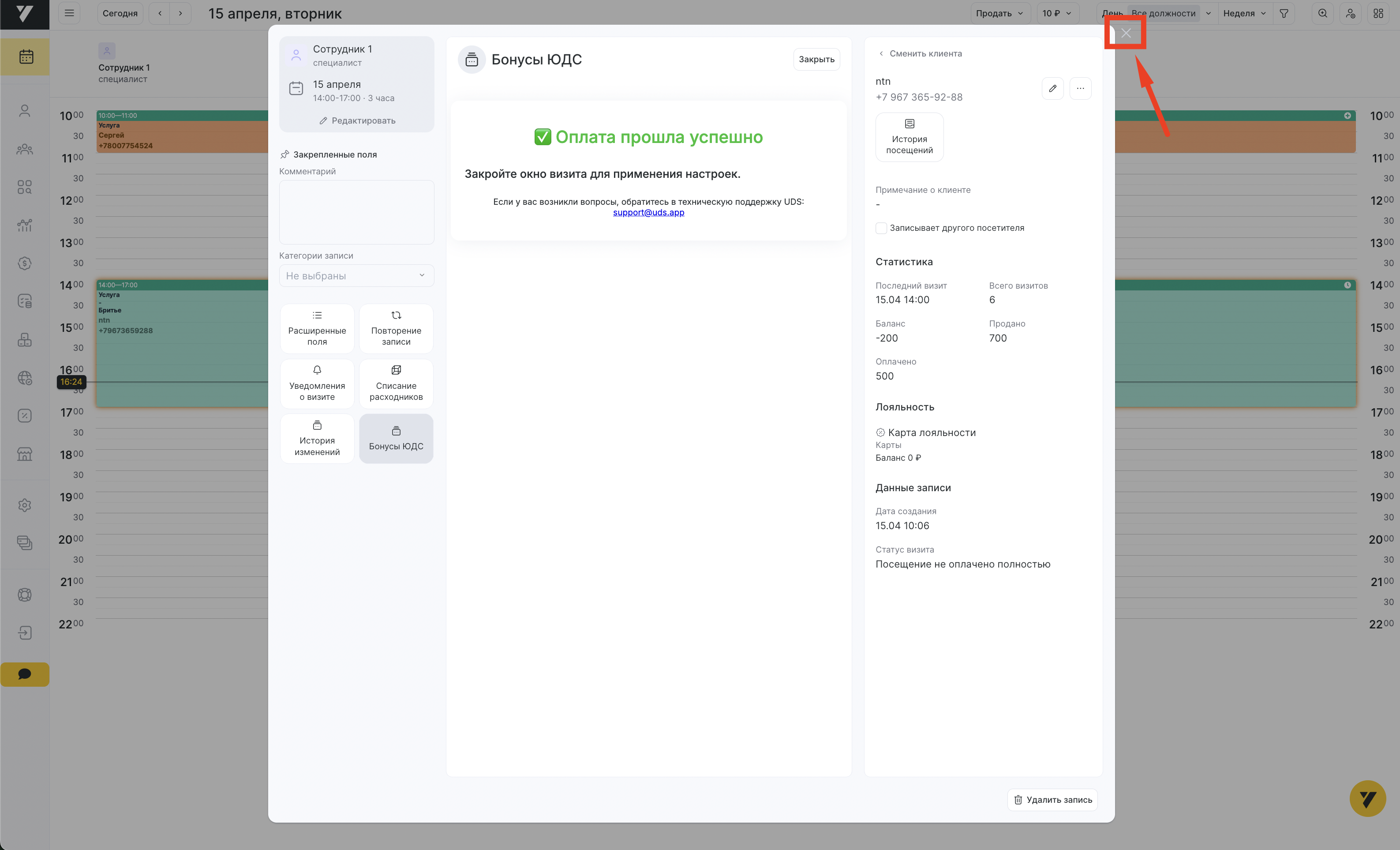 Шаг 4. Закройте запись/визит для отмены применения бонусов на позициии в визите.