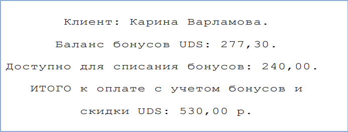 4. После успешной авторизации гостя будет распечатан пречек, на котором отобразится информация об общем количестве баллов клиента, о доступном для списания количестве баллов и оставшейся сумме для оплаты. Сумма для оплаты учитывает начисленную скидку и выбранное при авторизации количество баллов для списания.