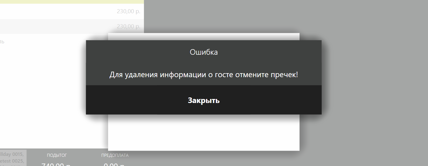 При нажатии кнопки отвязки гостя в заказе с пречеком, будет выведено сообщение об ошибке: