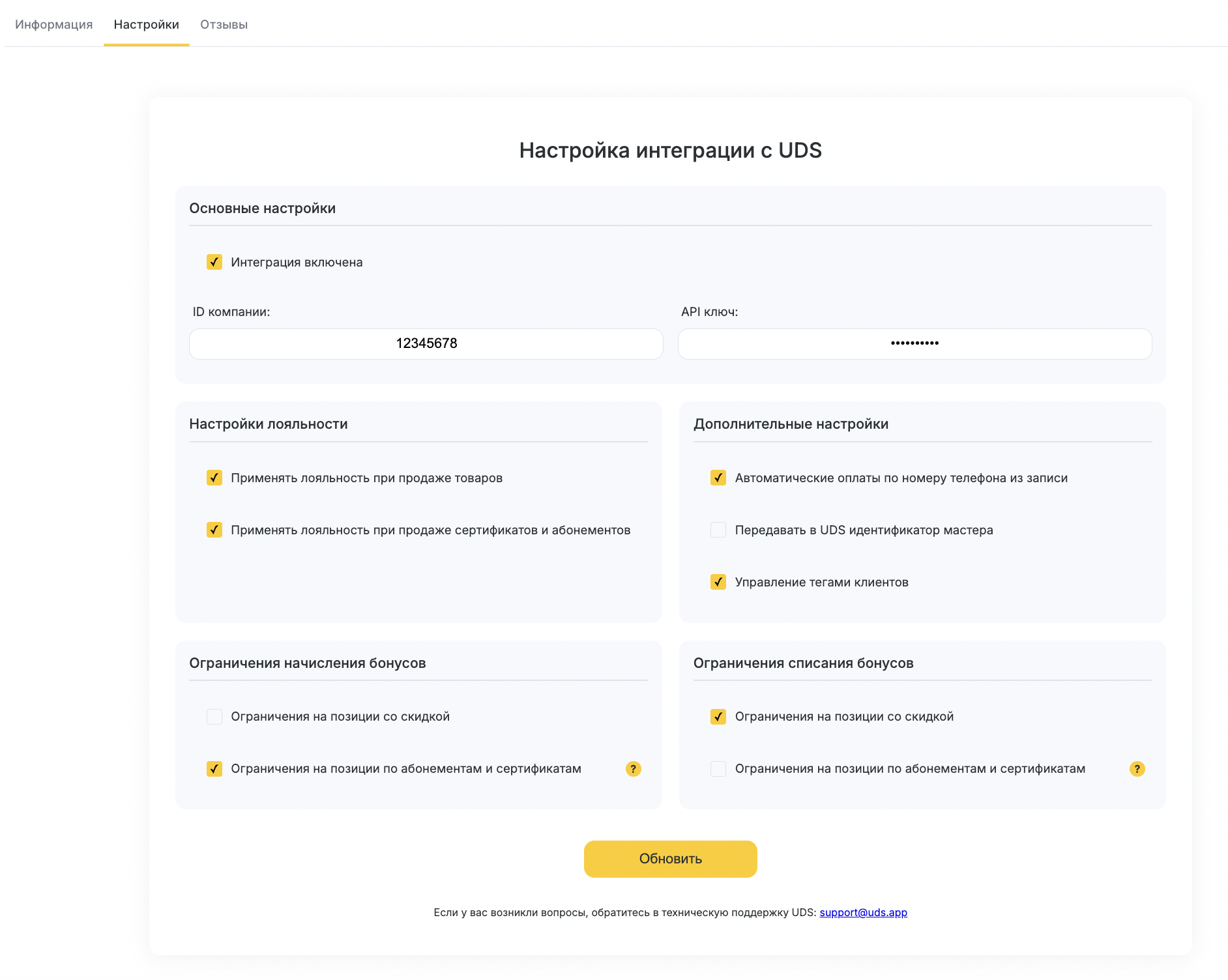 Шаг 3. В открывшемся окне «Настройки» введите ID компании и ключ API из личного кабинета UDS Бизнес, выберите необходимы параметры работы програмы лояльности и нажмите кнопку «Сохранить»