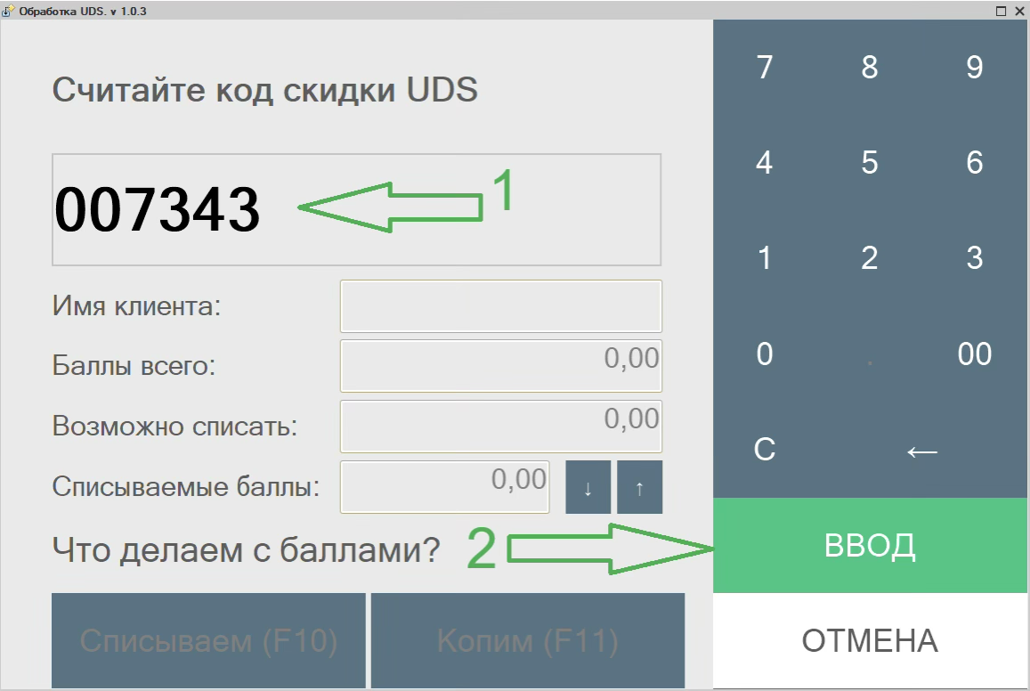 Шаг 2.Откроется окно ввода кода скидки UDS. Необходимо считать код скидки сканером или ввести код вручную и нажать «ВВОД».
