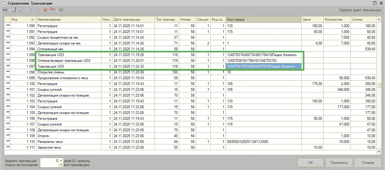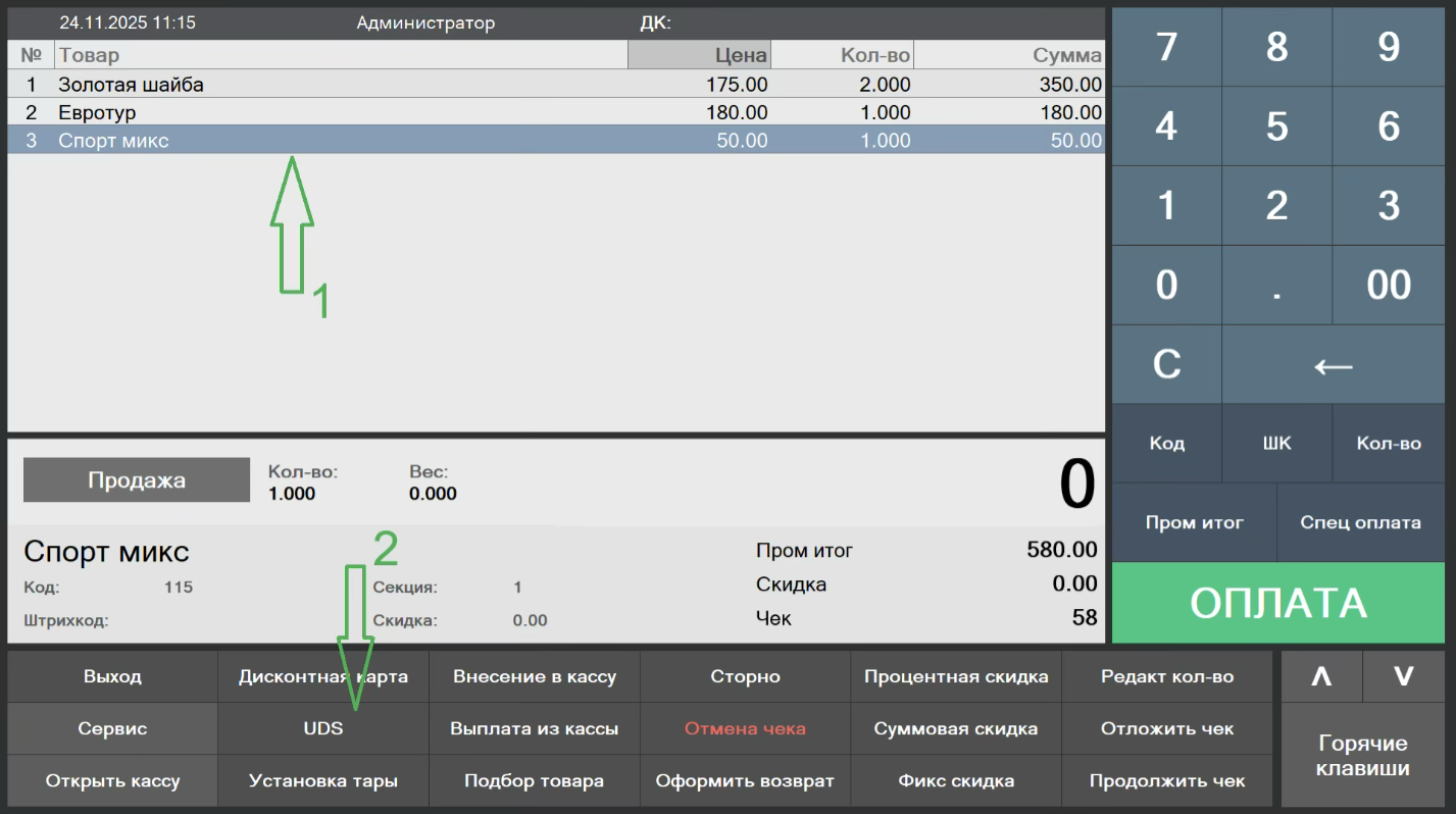 Шаг 5. После ввода кода скидки табличная часть с товарами не редактируется. Если до момента пробития чека необходимо внести изменения в чек (добавить товар, удалить или изменить количество), то необходимо отменить примененный код UDS. Для этого нажимаем кнопку «UDS. Отмена»