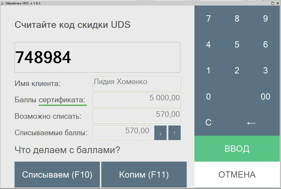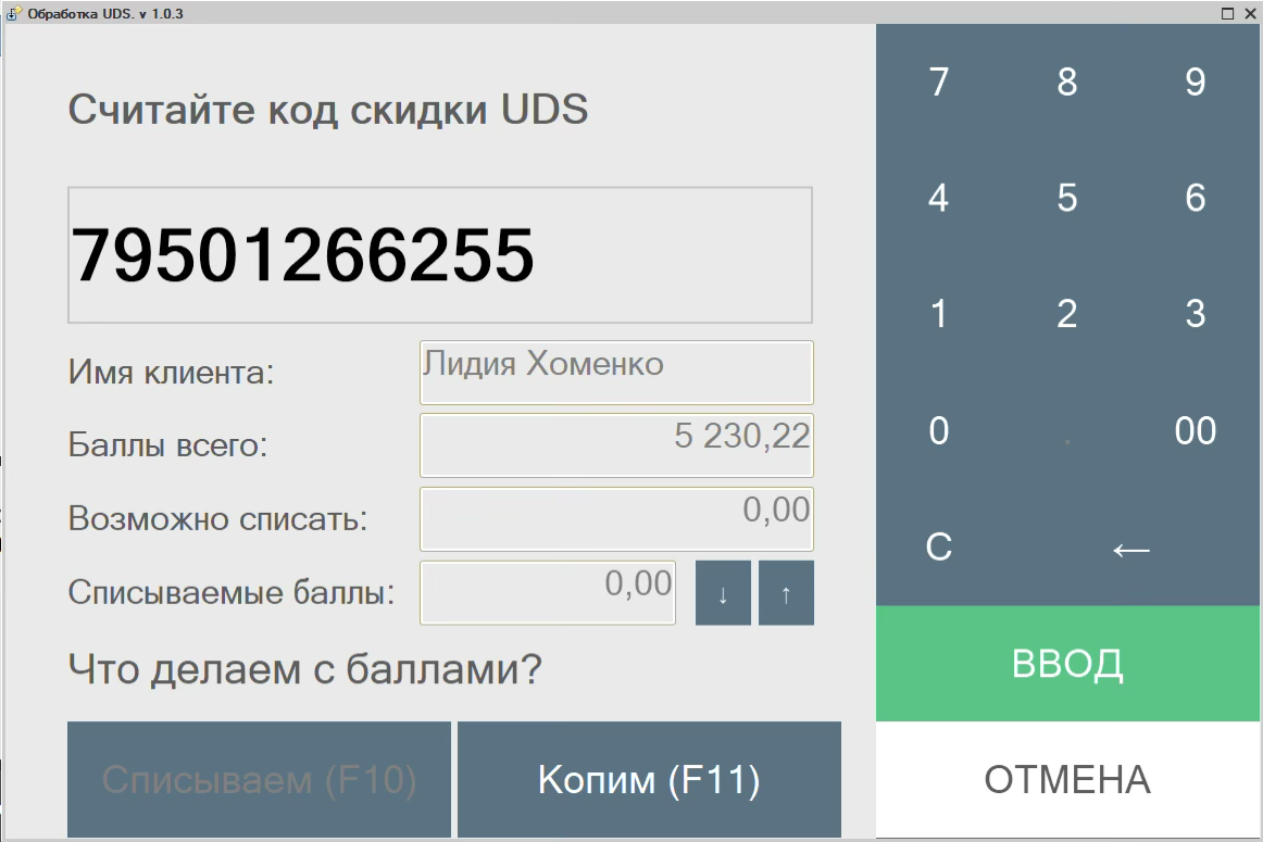 Далее необходимо нажать одну из кнопок «Списываем» или «Копим». В этот момент происходит проведение транзакции в UDS.